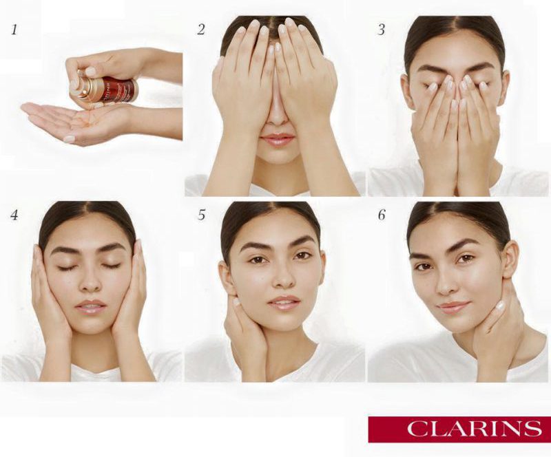 El sérum completa los cuidados de día y de noche y representa una verdadera ventaja en la rutina de belleza para que una mujer siga teniendo una piel firme y luminosa. El sérum para el rostro es un tratamiento intenso, altamente concentrado en activos. Es rápidamente absorbido gracias a su textura ultrafina y ligera, y prepara la piel para los cuidados antiedad que se aplican posteriormente haciendo que sean más eficaces. La piel, lisa, gana en firmeza y en suavidad. Aplícalo regularmente o para algún desequilibrio puntual: hay una amplia gama de sérums para rostro que responde a las necesidades de cada piel y varía en función de la edad. Antes de utilizarlo sobre el rostro dando pequeños toquecitos, se recomienda poner una gotas en la palma de la mano para calentarlo y despertar los activos. En CLARINS nos proponen una forma de aplicación muy eficaz tal y como se ve en la imagen.